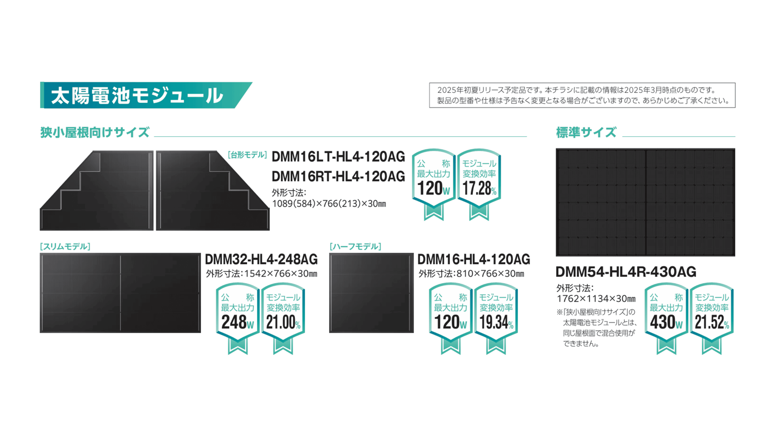 まず、標準モデルは430Wで、変換効率が21.52%です。それから、スリムモデルは248W、変換効率は21.00%です。ハーフモデルは123W、変換効率19.34%、台形モデルも123Wで、変換効率は17.28%です。