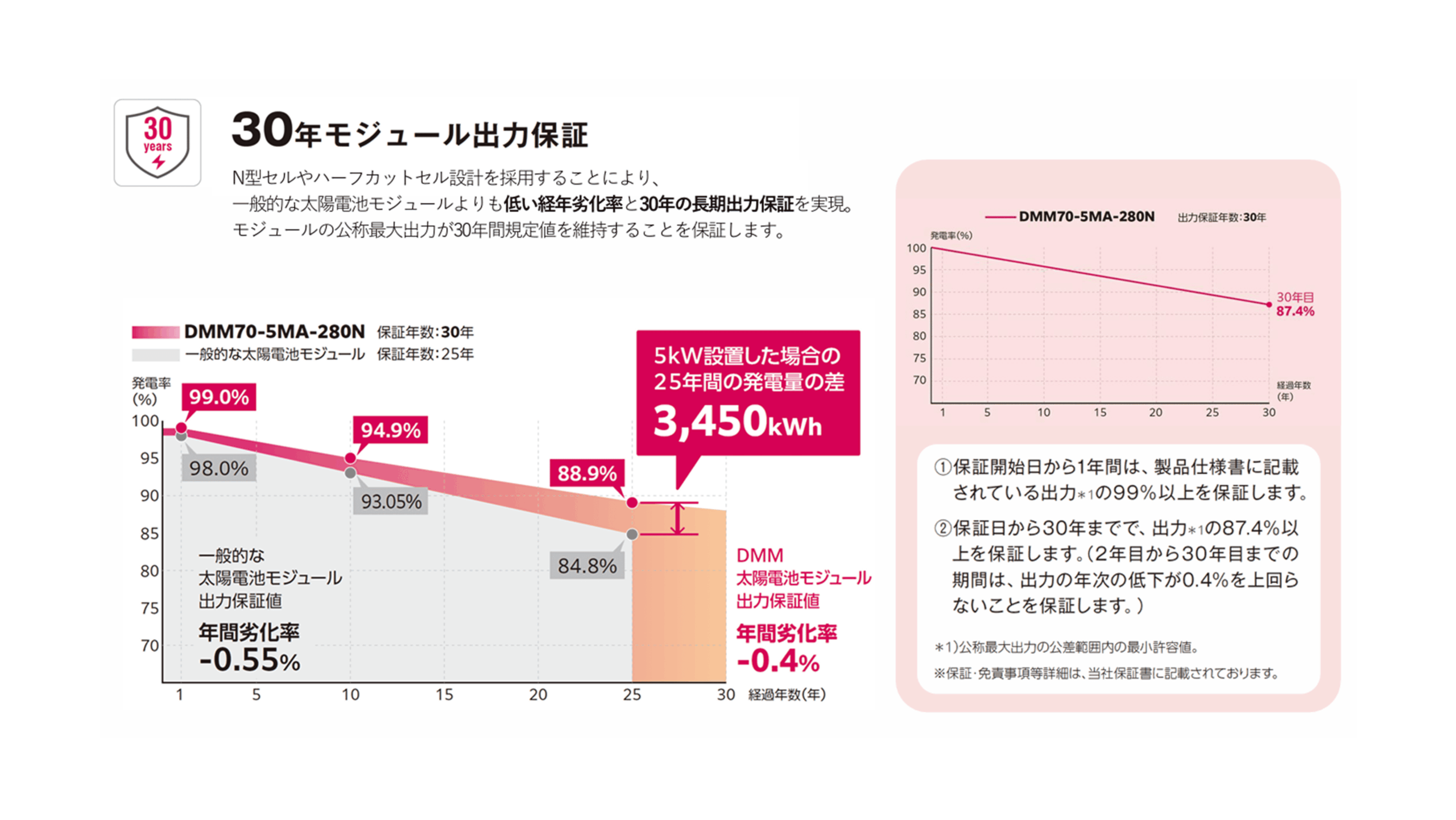 出力保証とは太陽光パネルの出力が一定の期間、規定の数値を下回った場合に、メーカーが修理や交換を行ってくれるものです。太陽光パネルは設置してからずっと同じ発電効率を維持することは難しく、年々少しずつ低下していきます。このような発電効率の低下も考慮したうえで、発電出力の保証値を定めています。現在は25年の出力保証が標準ですが、30年あるっていうのは業界の中でもかなり長めです。
