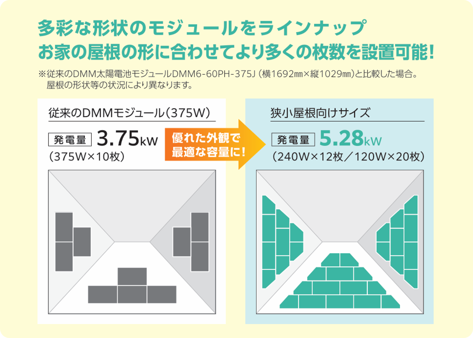 海外メーカーのパネルは基本的にサイズが大きく設計されています。そのため、日本の住宅の屋根の場合、効率良く設置できないことが多いです。DMMエナジーはそれらの事情をしっかりと反映していて、日本にあったOEMパネルになっています。