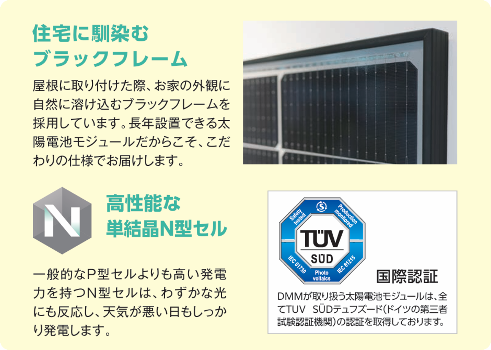 そして最後に、太陽電池セルの性能もバッチリです!単結晶のN型太陽電池セルを採用しており、P型太陽電池セルよりも発電力が高くて、しかも曇りの日や弱い光でも発電量を期待できます。これから太陽光発電を導入される方は、「N型は基本」と覚えてください!