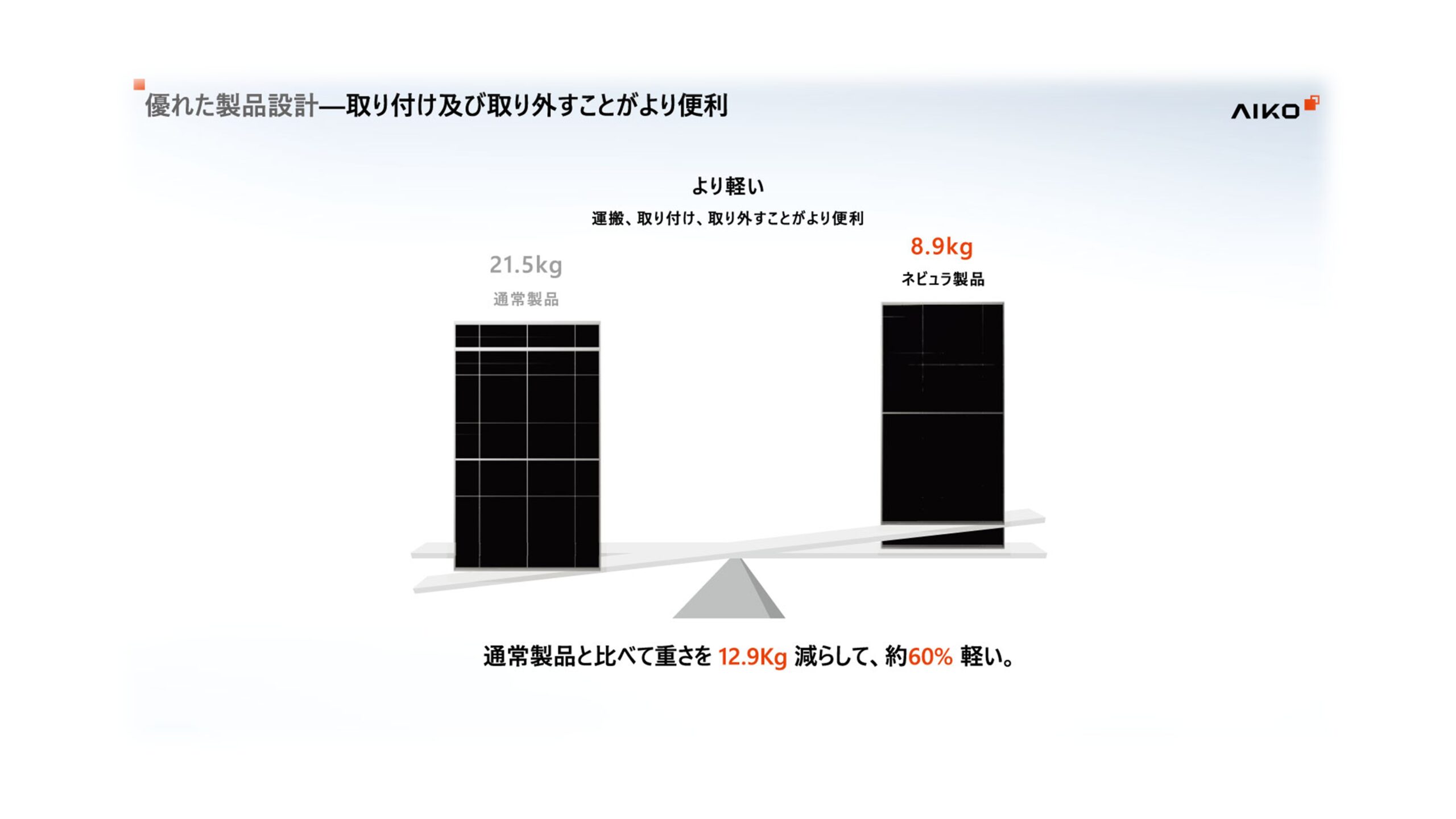 もうひとつ注目したいのが、その「軽さ」です。ネビュラは1枚あたりの重さがわずか8.6kgしかなく、一般的なパネルが20kg前後あることを考えると、非常に軽量な設計だということがわかります。屋根への負担が少なく、施工時の安全性も高まるため、住宅へのやさしさという点でも評価できます。