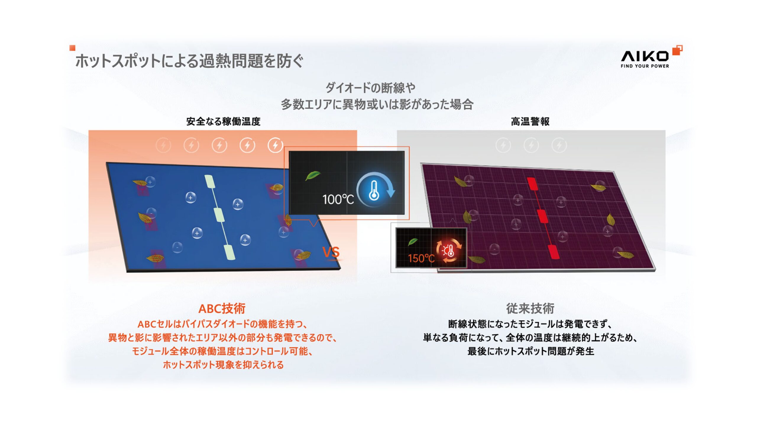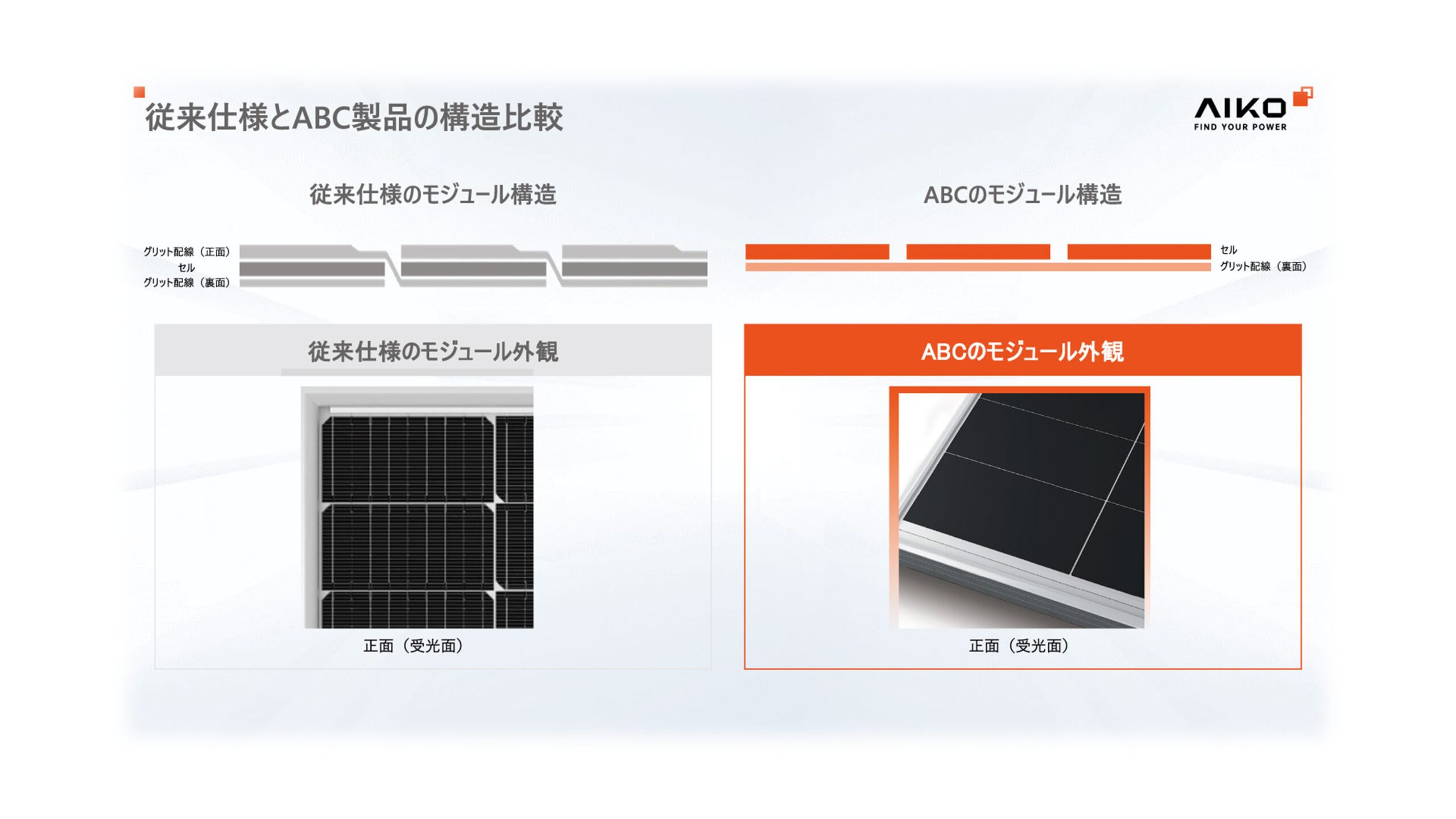 また、「ネビュラ」シリーズには、AIKOソーラーが独自に開発したN型ABC(All Back Contact)という技術が採用されています。これは、パネルの裏側に電極をまとめることで、表面に配線がない美しいデザインを実現すると同時に、発電の妨げとなる影の影響を最小限に抑える設計になっています。