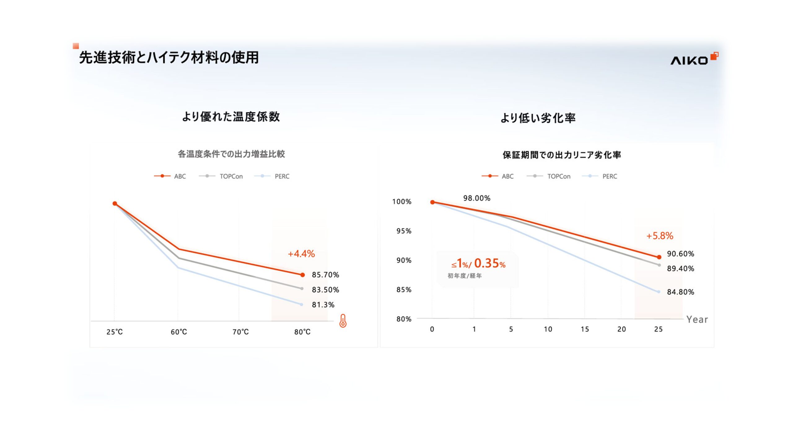 さらに、温度変化への強さも大きな特長です。太陽光パネルは一般的に、気温が高くなると発電効率が落ちてしまう傾向がありますが、ネビュラの温度係数は-0.26%/℃と非常に優秀で、夏場の高温時でもしっかりと発電力を維持できます。特に日本のような四季のある地域では、この性能が年間を通じて安定した発電量につながります。