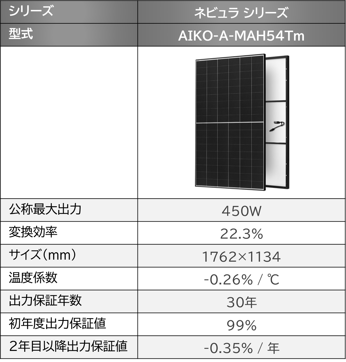 まず注目すべきは、その高い出力性能です。「ネビュラ」は1枚あたりの出力が450Wと非常に高く、少ない枚数でしっかりとした発電量を確保できるのが大きな魅力です。