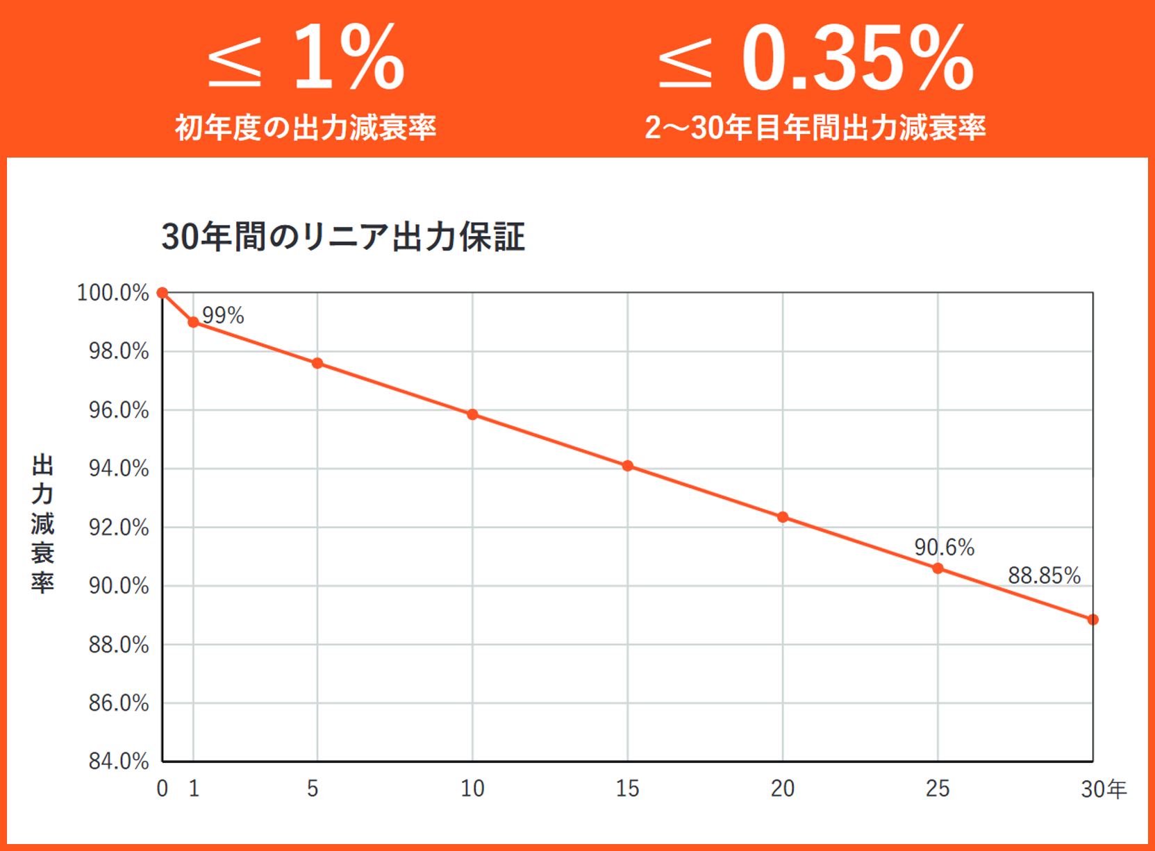 加えて、長期保証にも対応しています。「ネビュラ」シリーズでは、25年間の出力保証が付いており、初年度は99%、2年目以降は年間0.35%ずつの緩やかな低下にとどまります。25年後の保証出力は90.6%となっており、非常に高い水準をキープできる設計です。