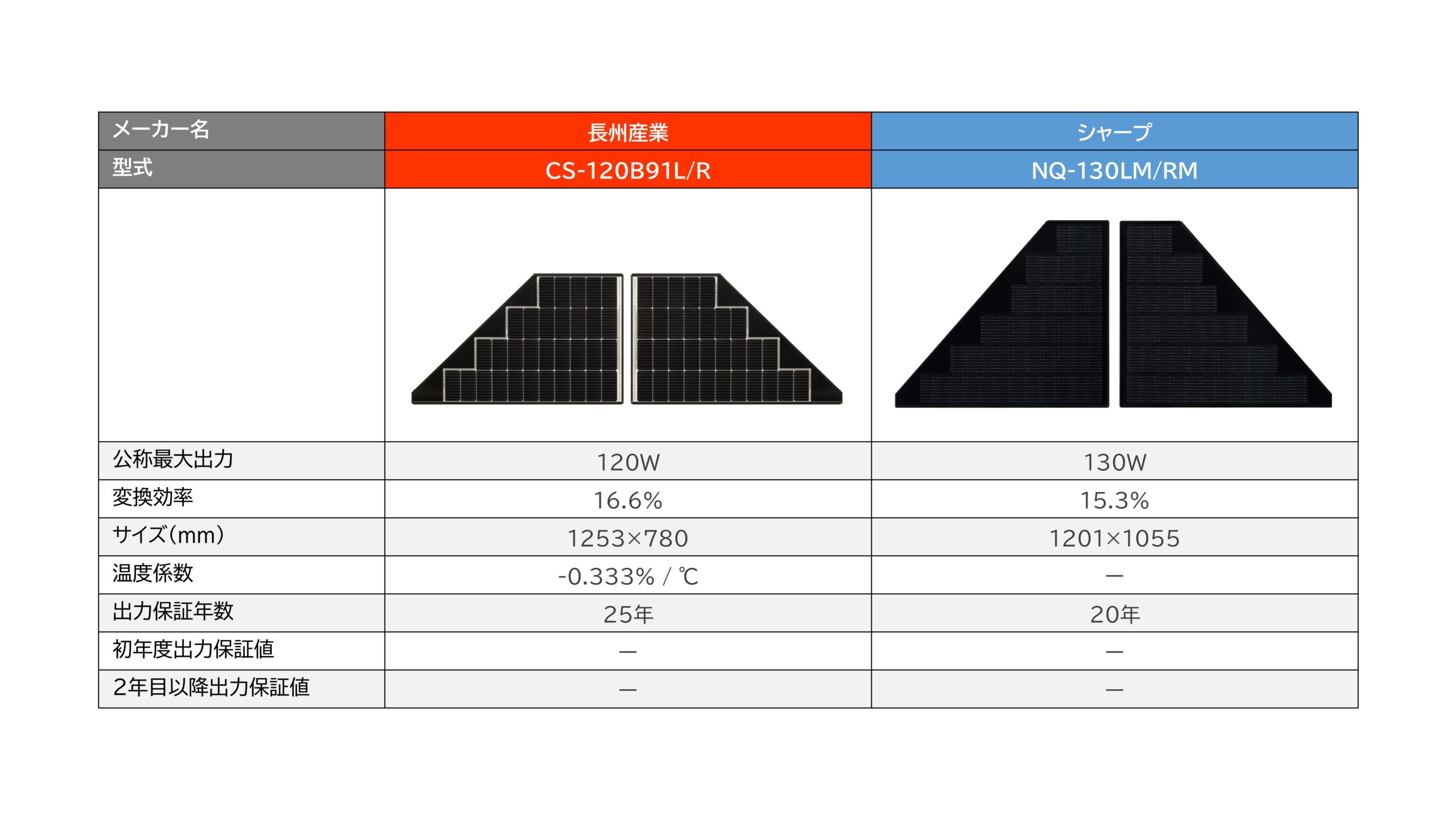 代表的な製品としては、長州産業の120Wの台形型パネルや、シャープの屋根対応型台形パネルがあります。屋根の形に合わせて美しくパネルを敷き詰めたい方、発電効率だけでなくデザインや施工性にもこだわりたい方にぴったりの選択肢です。