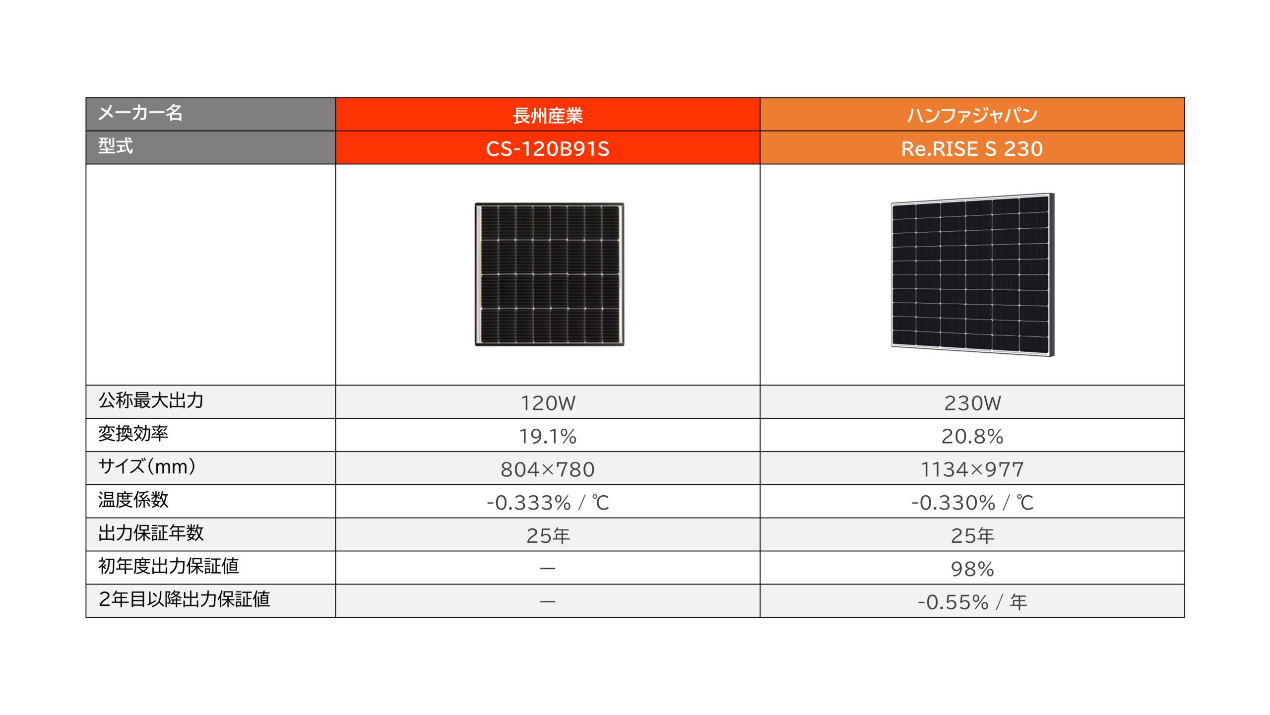 小型パネルの具体例としては、長州産業の120Wのパネルや、ハンファジャパンの「Re.RISE」シリーズにラインナップされている230Wの小型パネルなどが挙げられます。こうした製品は、限られたスペースを有効に活用したいという方に特におすすめです。