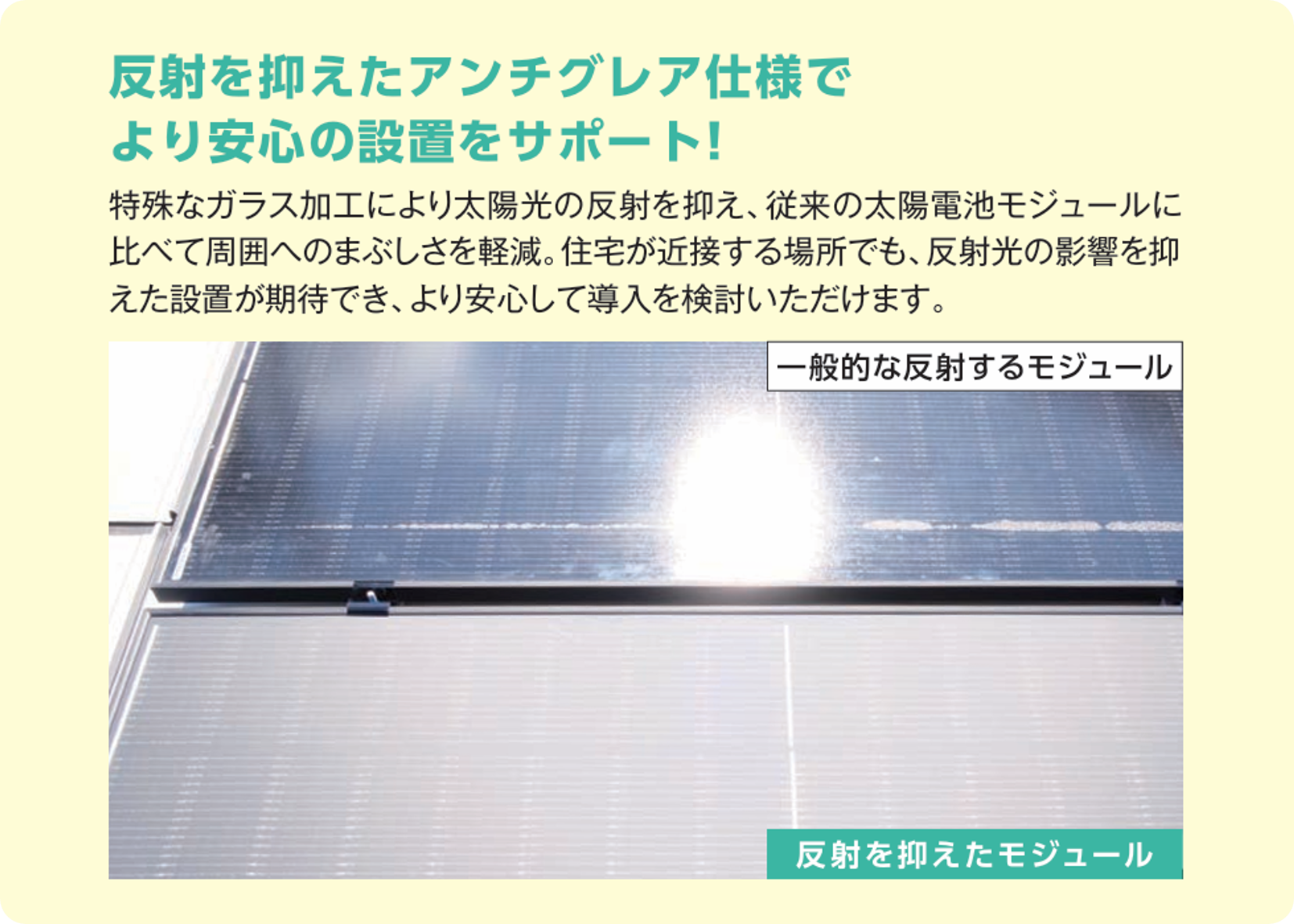 さらにこのパネルには防眩機能が備わっており、表面の特殊な処理によって太陽光の反射を抑えることができます。そのため、周囲の住宅や道路に対して光のまぶしさを抑え、ご近所への配慮も万全です。