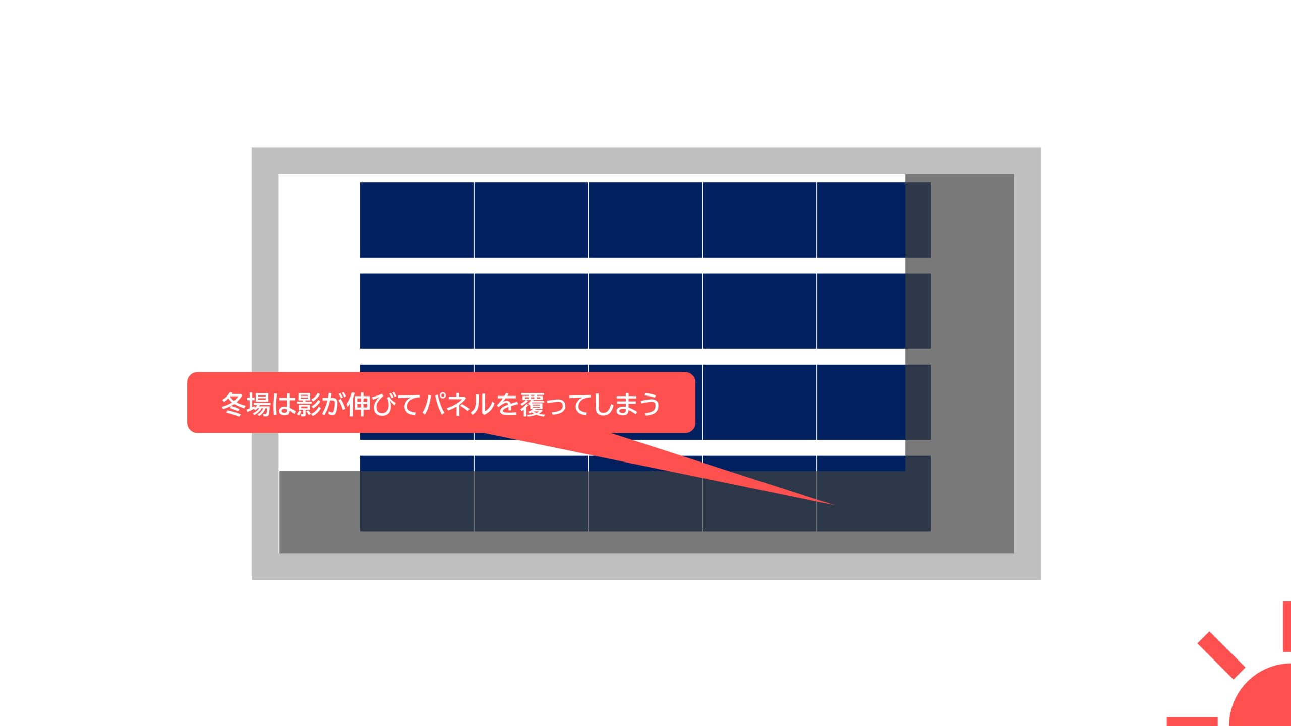つまり、パラペットのすぐそばにパネルを置いてしまうと、夏の間は影がかからなくても、冬になると想像以上に長い影が伸びて、パネルの発電に影響してしまうことがあります。ですので、私たちとしては、パラペットに近い位置には基本的にパネルを設置しないようにするのがセオリーです。