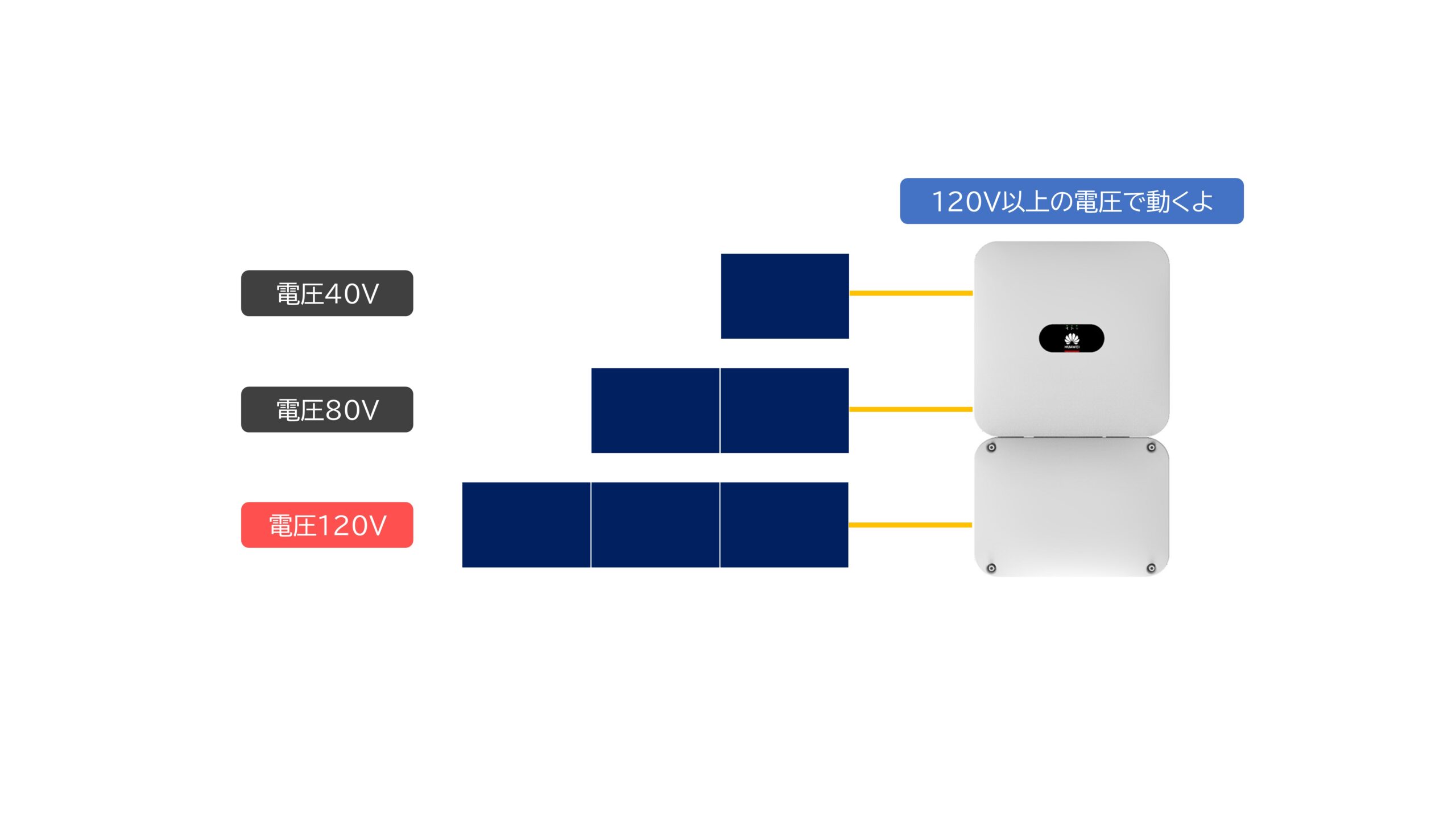 たとえば、パワコンの起動電圧が120Vだとすると、1枚で40Vのパネルであれば、最低でも3枚以上は直列につなげないと動かないということになります。こういった理由から、住宅用の太陽光システムでは2枚~3枚以上のパネルを1つの回路にまとめて設置するのが基本になります。