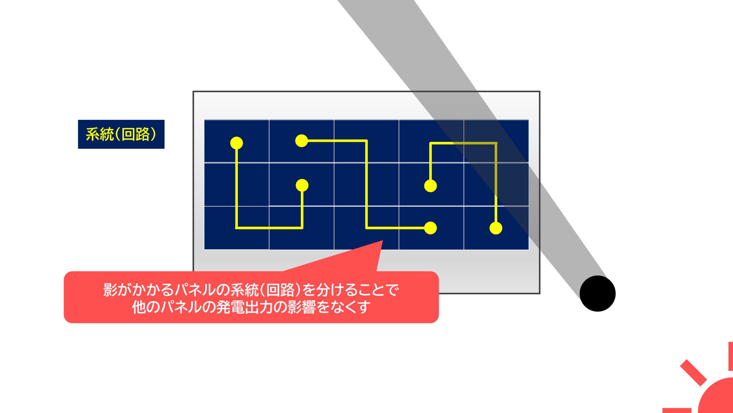 ここで気をつけたいのは、その影のかかるパネルと、日中ずっと日が当たる左側のパネルを同じ回路につなげてしまうと、朝の間は左側のパネルまで一緒に発電が抑えられてしまうという、非常にもったいないことが起きてしまうという点です。