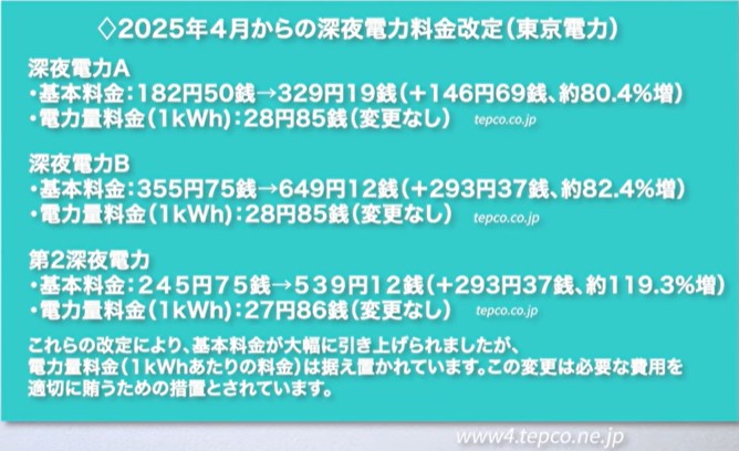 では、ここから本題に入っていきます!今回のブログで最初にお伝えした「最近の深夜電力の値上げ」について、詳しく見ていきましょう。東日本大震災以降、電力会社は燃料費の高騰や発電コストの増加などを背景に、段階的に電気料金を引き上げてきました。この影響を受けているのは通常の電気料金だけではありません。なんと、深夜電力も例外ではなく、むしろ“深夜料金の方が値上げ幅は大きくなっている”というデータも出てきています。