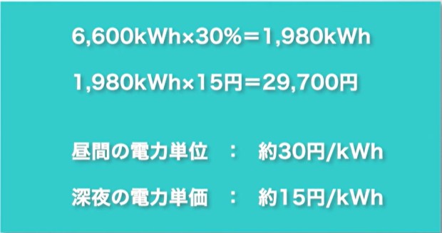 そして、もうひとつ注目したいのが「オール電化住宅」です。給湯・暖房・調理といった暮らしに欠かせない熱源を、すべて電気でまかなっているご家庭では、深夜の割安な電気を活用することで光熱費を大きく抑えることができます。たとえば、深夜のうちにエコキュートでお湯を沸かしておく、あるいは蓄熱暖房機で夜のうちに熱を蓄えておくなど、生活スタイルにうまく取り入れることで非常に効率よく節電ができます。目安として、4人家族のオール電化住宅では、年間の電気使用量はおよそ6,600kWhと言われています。もちろん、すべての電気使用を深夜に移すのは現実的ではありませんが、たとえばそのうち30%だけでも深夜にシフトできれば、年間でおよそ3万円の電気代を節約できるという試算もあります。