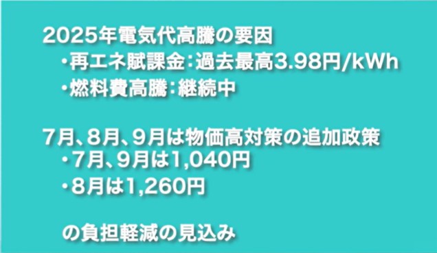 再エネ賦課金は過去最高の3.98円/kWh、政府の電気代補助も4月で終了…。ただ、7月から3か月間の再補助が決まり、標準的な家庭で最大3,300円程度の負担軽減は見込めます。それでも夏の電気代は、4人家族の場合、昨年よりも6,000円〜最大15,000円高くなる可能性があります。