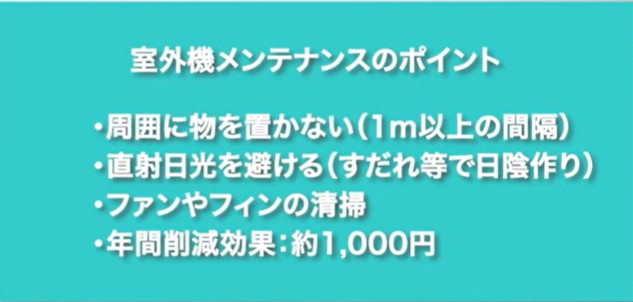 そして忘れてはいけないのが、フィルターの掃除です!月に1回、お掃除機能がない場合は特に、こまめに掃除してあげてください。これだけで、年間700円くらいの節電になると言われています。また、室外機も、直射日光に当たっていたり、周りに物が置いてあったりすると、うまく排熱できなくてエネルギー効率が下がってしまいます。室外機の周りには1m以上の間隔を空け、すだれなどで日陰を作ってあげると、約5~10%の省エネ効果が期待できます。また、室外機のファンにホコリがたまると効率が落ちるので、夏前や冬前に清掃することをおすすめします。