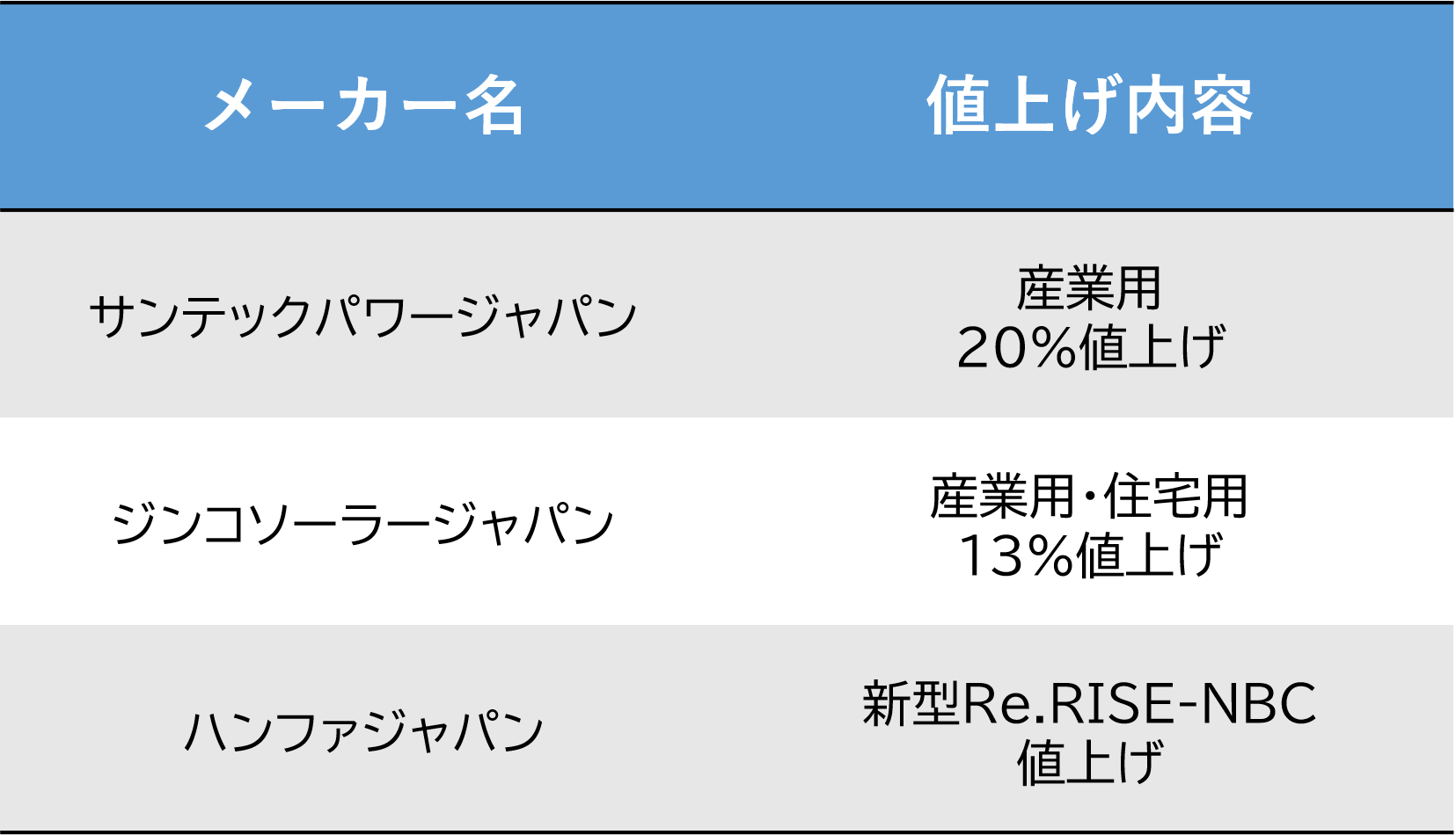 さらに住宅用では、ハンファジャパンの新型 Re.RISE-NBC が登場しています。このモデルは値上げという形ではありませんが、原材料の高騰や中国の政策リスクを踏まえ、最初からやや高めの価格設定がされています。つまり、新製品の段階で、すでに世界的なコスト上昇の影響が反映されているということです。このように、産業用を中心とした値上げは事実として進んでおり、住宅用でも新モデルの価格にその影響が表れ始めています。