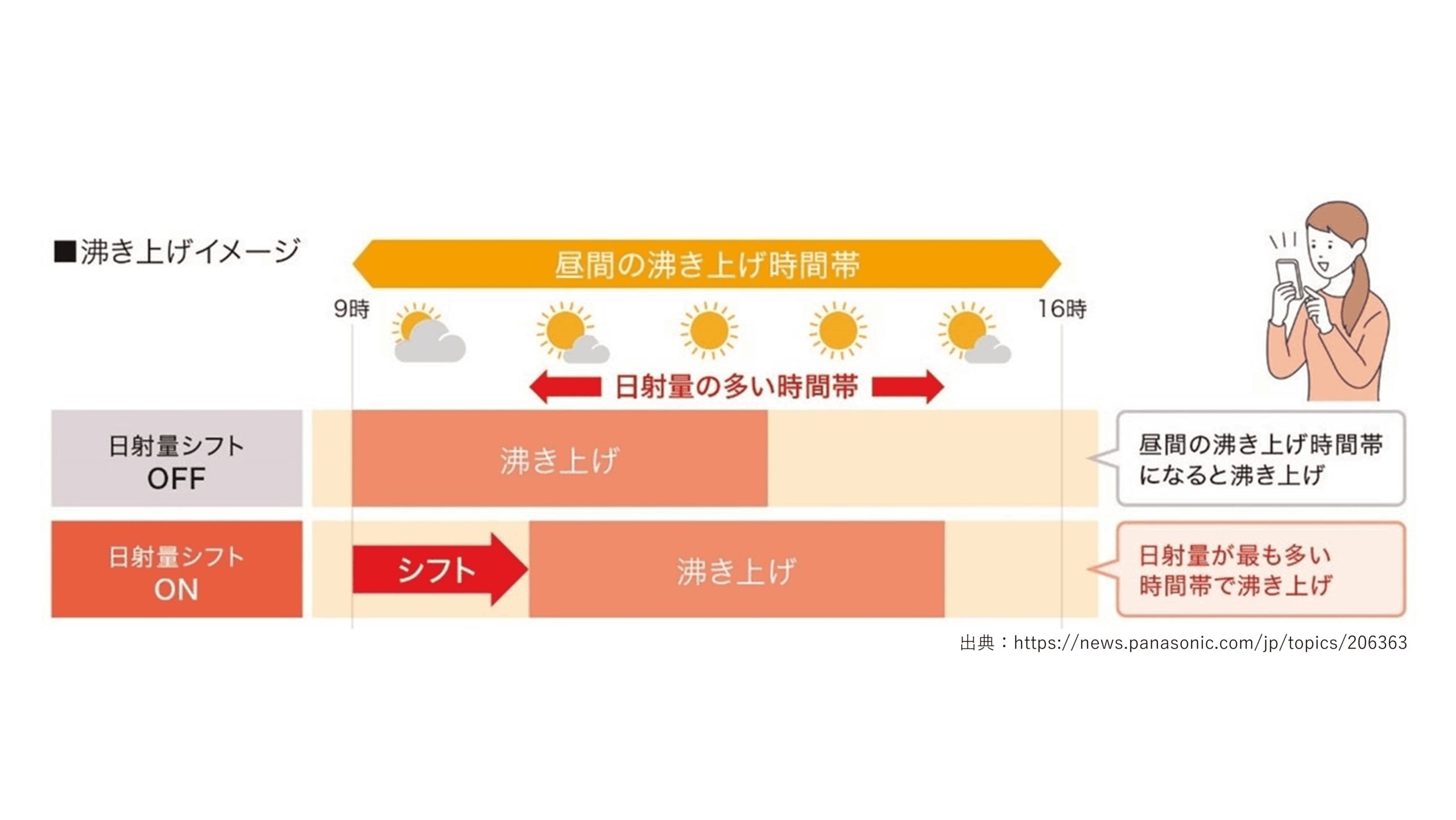 まさに“都市型住宅のために生まれたエコキュート”です。もちろん、パナソニックならではの「日射量シフト」機能も搭載しています。これは、専用アプリ「スマホでおふろ」を通じて翌日の日射量予報を取得し、発電量が多くなりそうな時間帯に合わせて自動で湯沸かしを行うというしくみです。つまり、天気に合わせて最も効率の良い時間にお湯を沸かしてくれる、かしこい給湯器です。太陽がよく出る時間帯にお湯を沸かすことで、発電した電気をより効率的に使うことができます。