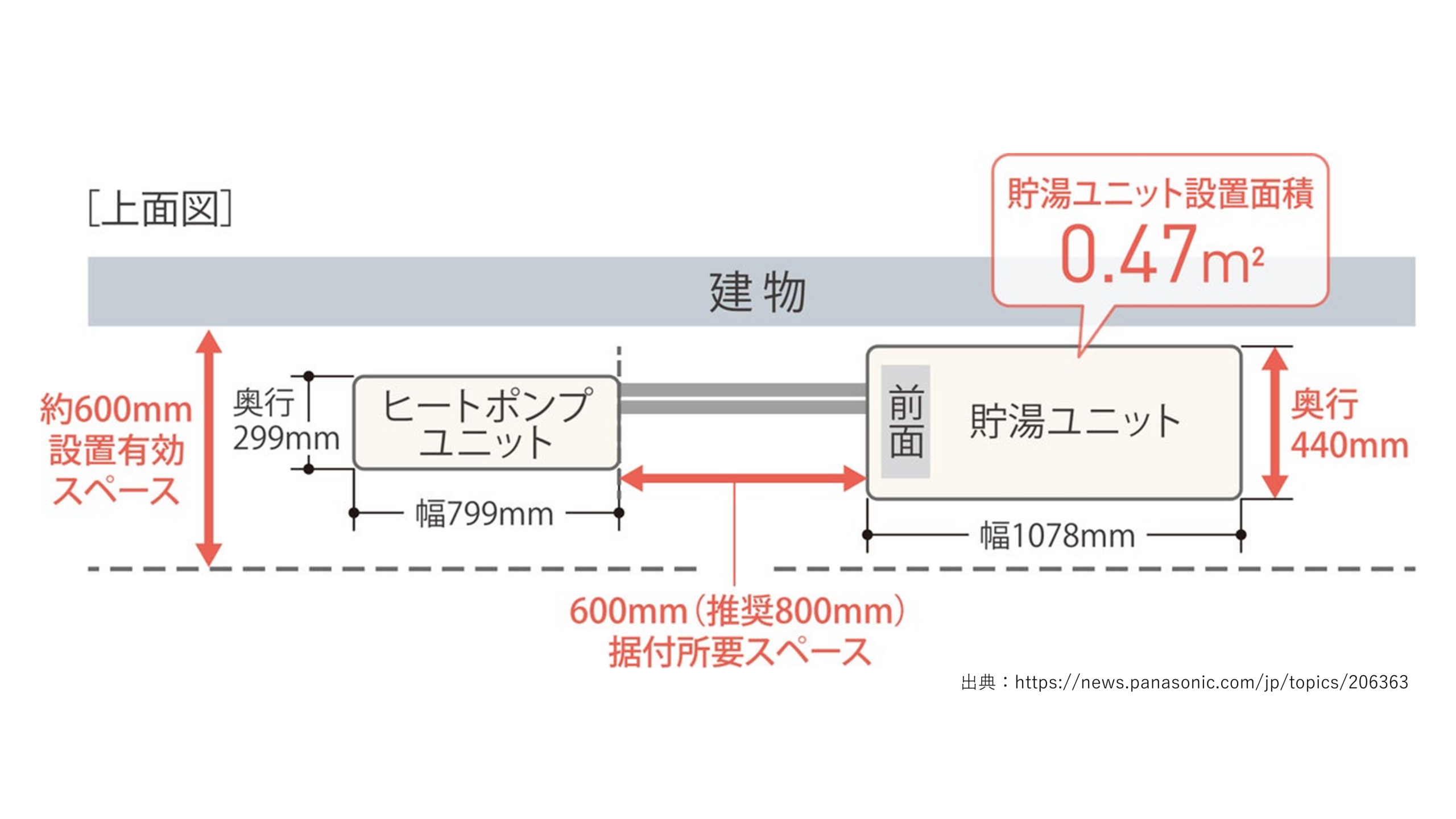 まず、今回の最大のポイントは、「薄型設計」であることです。従来の角型タイプが奥行き約68cmだったのに対して、今回のモデルは奥行き約44cmと、約35%もコンパクト化されています。さらに、ヒートポンプユニットの前面吹き出し距離は20cmあれば設置することができます。つまり、建物と壁の間におよそ60cmのスペースがあれば設置することができます。これまで「置く場所がなくて設置できなかった…」という都市部の住宅や、スペースに制限のあるご家庭にも導入しやすくなりました。