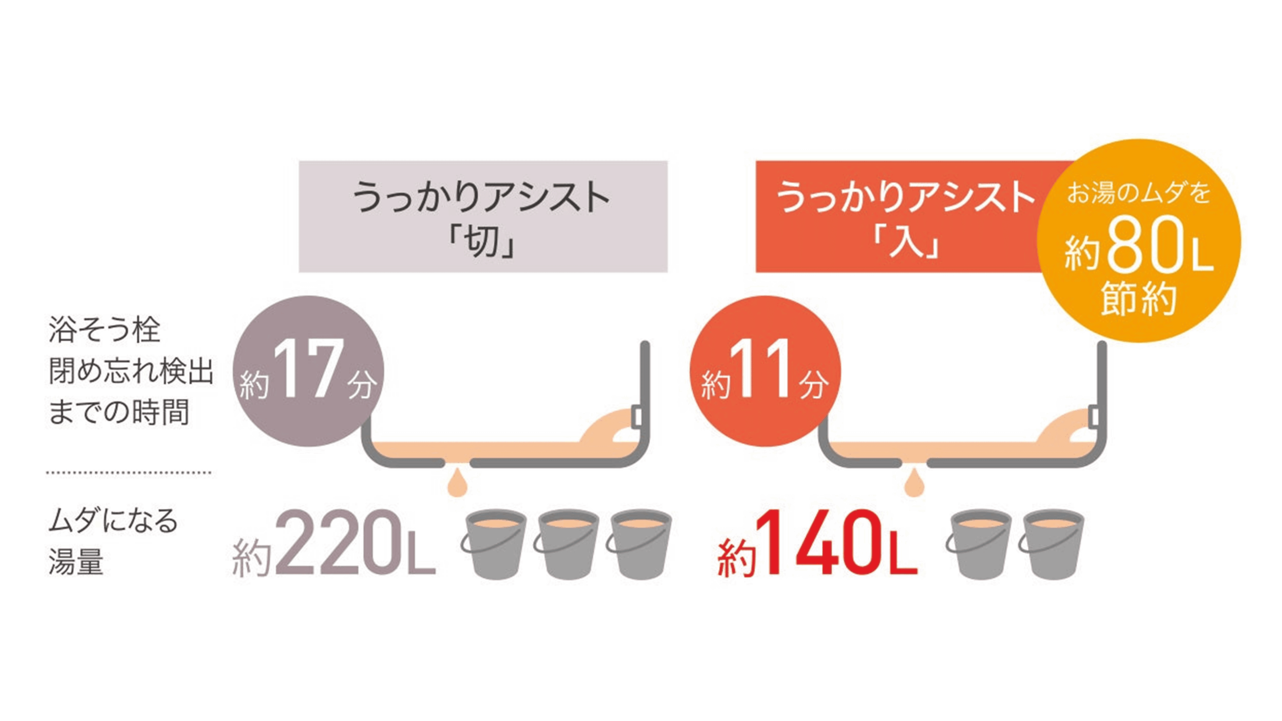 さらに、今回の「おひさまエコキュート」は、使い勝手や快適性の面でもしっかり進化しています。まず注目したいのが、「うっかりアシスト」機能です。これは、浴槽の栓を閉め忘れたままお湯はりをしようとすると、異常を検知してスマホアプリやリモコンでお知らせしてくれる機能です。うっかりミスによるお湯のムダ使いを防ぎ、水道代・電気代の節約にもつながります。