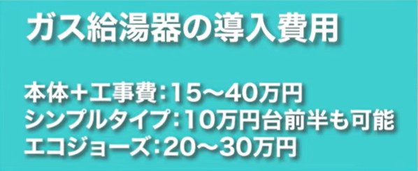 つまり、都市ガスなら比較的コストを抑えられますが、プロパンガスのご家庭では光熱費が高くなりやすいということです。初期費用に関しては、ガス給湯器のほうがかなり安く、本体と設置費用を合わせても20万円から30万円台で導入できます。