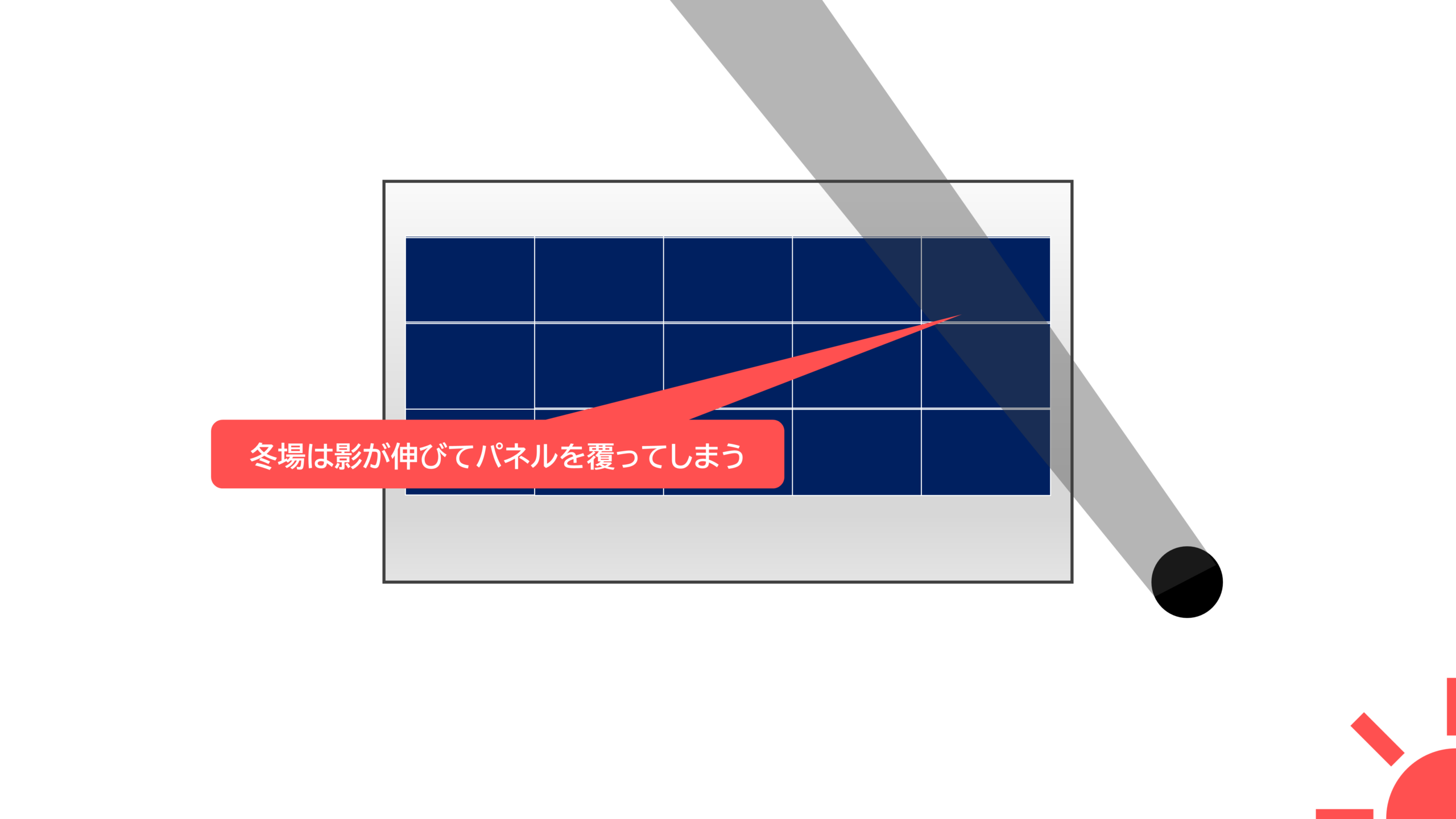 また、太陽の高さが低いぶん、建物や電柱、樹木の影が長くなりやすく、午前や午後の時間帯に影がパネルにかかりやすくなる点も注意です。