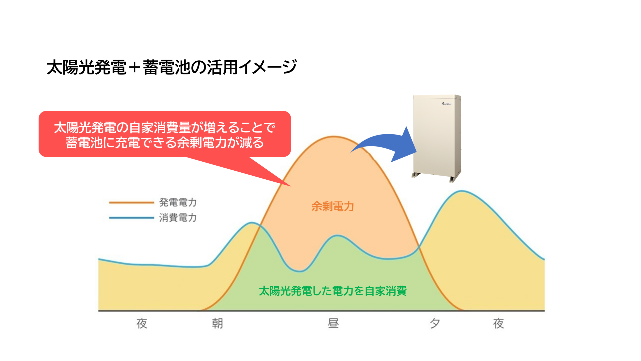 さらにもう一点、エコキュートの消費電力量にも注意が必要です。冬はお湯を沸かすために使用する電力量が大きくなり、特に「おひさまエコキュート」など昼間に沸き上げを行うタイプをご利用のご家庭では、昼間の太陽光発電がそのまま給湯に使われるため、自家消費量が増え、蓄電池に充電される電力量が減る傾向があります。このため、冬は昼間の発電が十分あっても、蓄電池への充電が少なくなります。