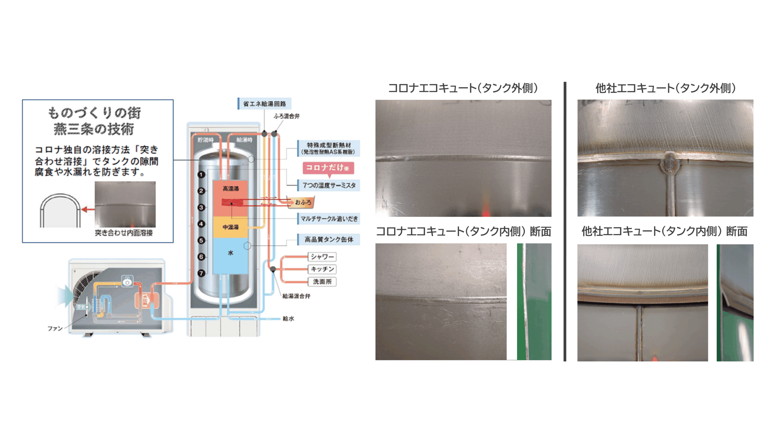 コロナのエコキュートは、このタンクの内側まで、高精度な溶接で丁寧に仕上げています。つなぎ目が少なく、余計な凹凸が出にくい構造なので、汚れがたまりにくく、長い時間がたっても劣化しにくい。