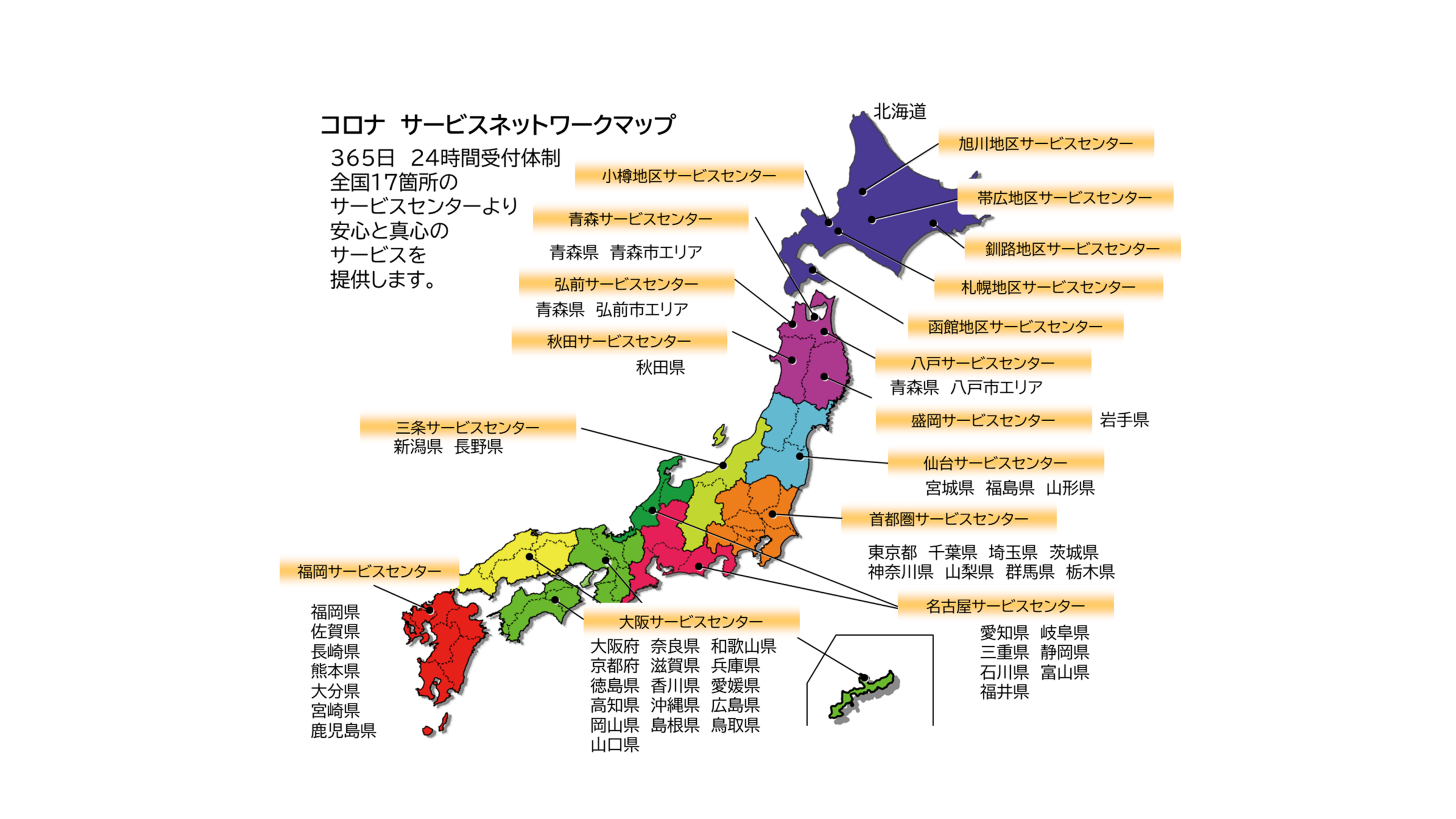 もちろん、サービスの受付は24時間365日対応です。平日だけでなく、土日や祝日、夜間でも、まず相談できる窓口があります。さらに、全国に営業拠点やサービスセンターがあるため、状況に応じてスピーディーな対応が期待できます。