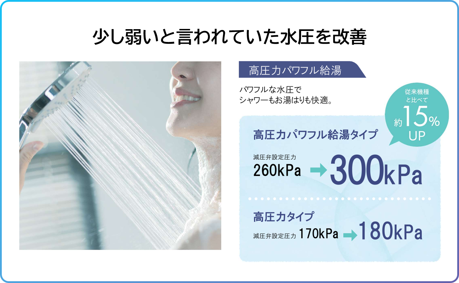 ではさっそく、コロナエコキュートの新機能について紹介いたします。まず一つ目が、お湯の勢い、いわゆる水圧です。シャワーの勢いが弱いと、使えないわけではないけれど、毎日のことだから、どうしても気になってしまいますよね。