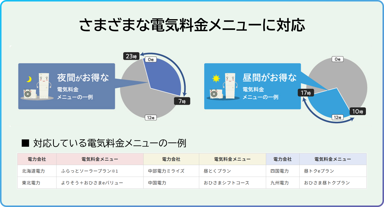 電気料金メニューを変更した場合でも、リモコンの設定を変えるだけで、そのプランに合わせた使い方ができます。