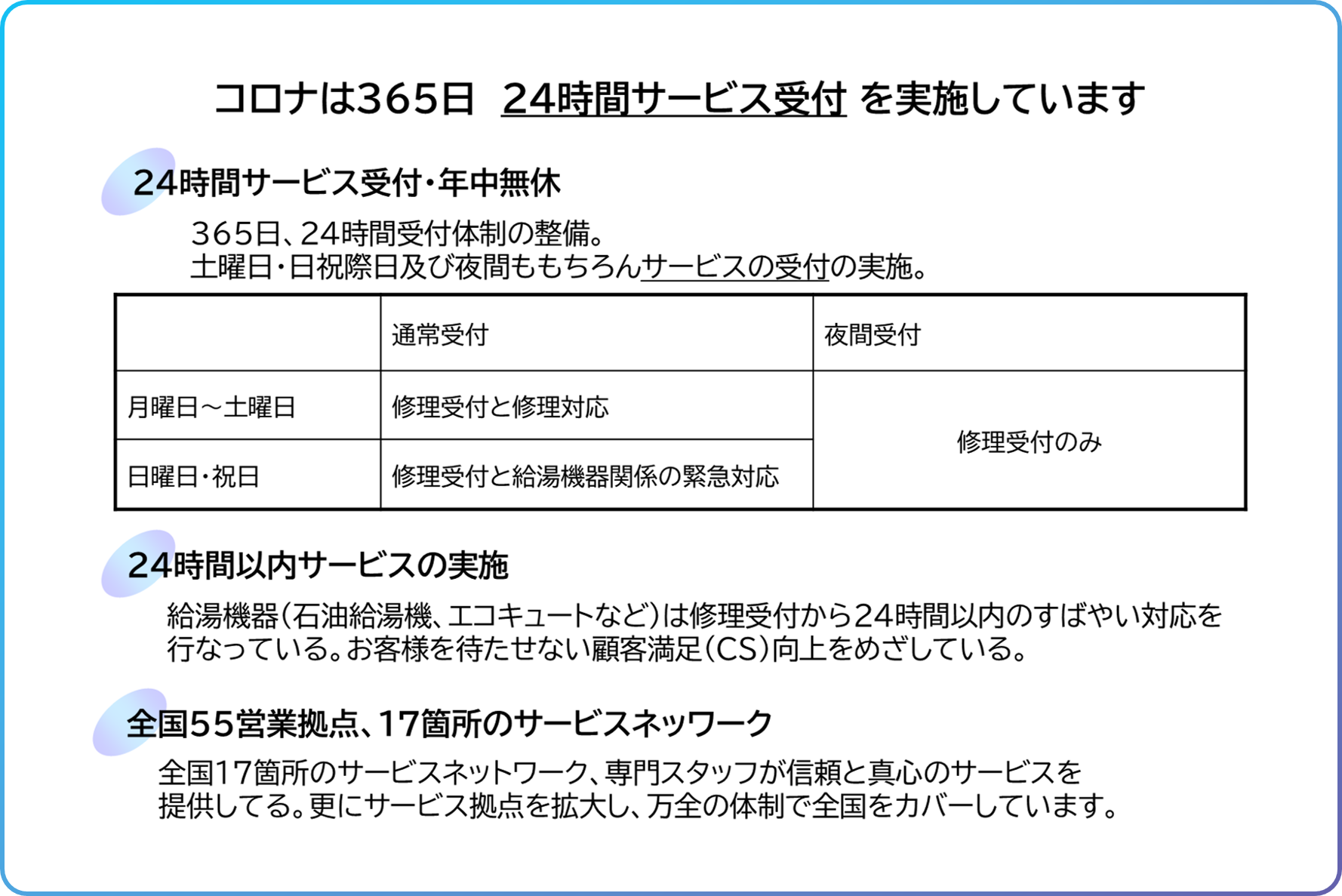 続いて、コロナのエコキュートが選ばれ続けてきた理由の二つ目です。それが、サービス体制の安心感です。