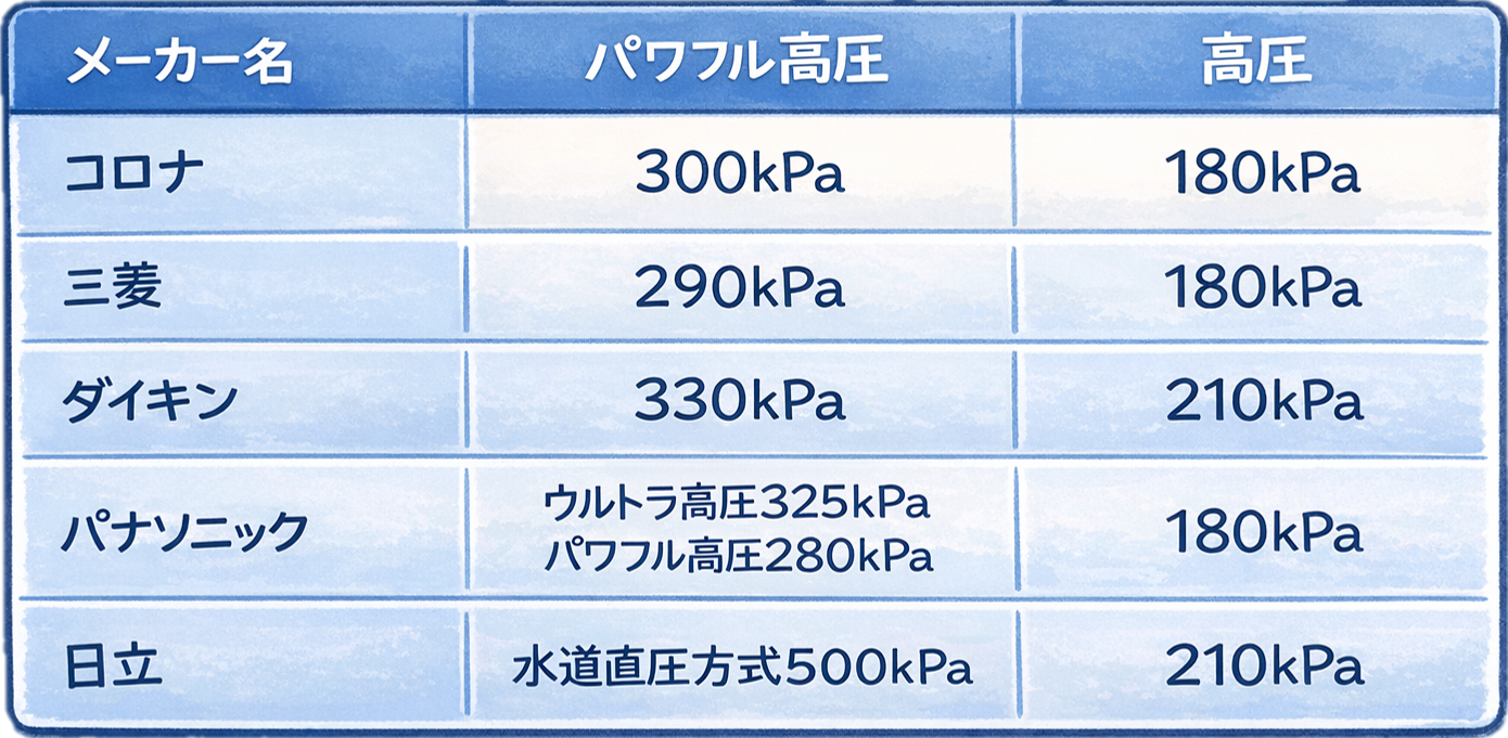 ただ、今回の新型では、この点がしっかり改善されています。コロナの新型エコキュートでは、高圧力パワフル給湯タイプが300kPa、高圧力タイプでも180kPaです。三菱のハイパワー給湯タイプは290kPaで、高圧力型は180kPa。パナソニックは、ウルトラ高圧が325kPa、パワフル高圧が280kPa、高圧タイプが180kPaとなっています。日立については、水道直圧給湯方式で500kPaという数値がありますが、これは水道の圧力を直接使う仕組みで、ほかのメーカーとは、そもそも考え方が違います。ダイキンは、パワフル高圧給湯が330kPa、高圧給湯が210kPaです。