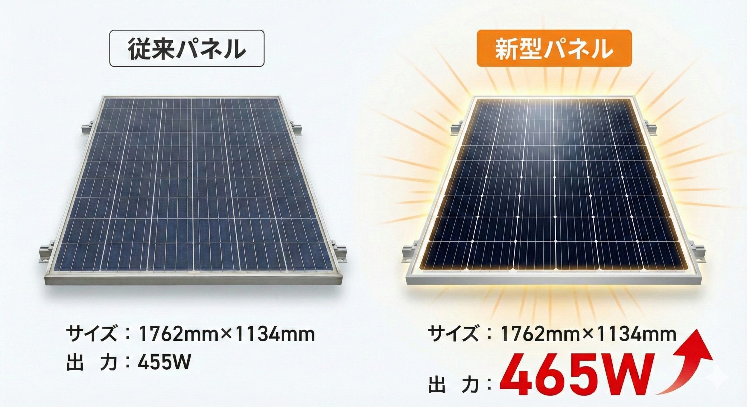 対 AIKO(性能重視モデル): 高出力ですがサイズが1種類のみ。屋根の形状によっては大きな隙間(デッドスペース)が生まれ、結果として総発電量が減ってしまうリスクがあります。