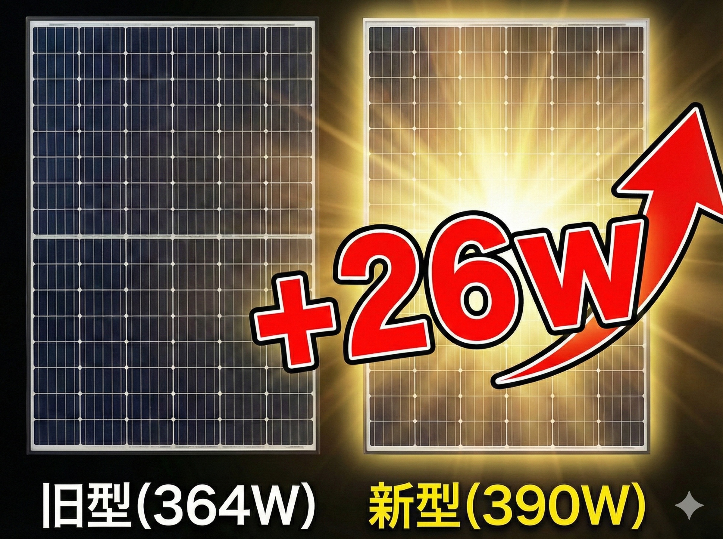 従来のP型セルから最新の「N型TOPCon」セルへ移行したことで、パネルの寸法を変えることなく出力と変換効率の底上げを実現しました。 例えば、主力モデルは従来品の364Wから「390W」へアップ(1枚あたり+26W)。変換効率も約22%前後まで向上しています。屋根の面積や設置枚数が同じでも、パネルの中身が進化したことで、生涯の発電量と経済メリット(売電・自家消費)に大きな差を生み出します。