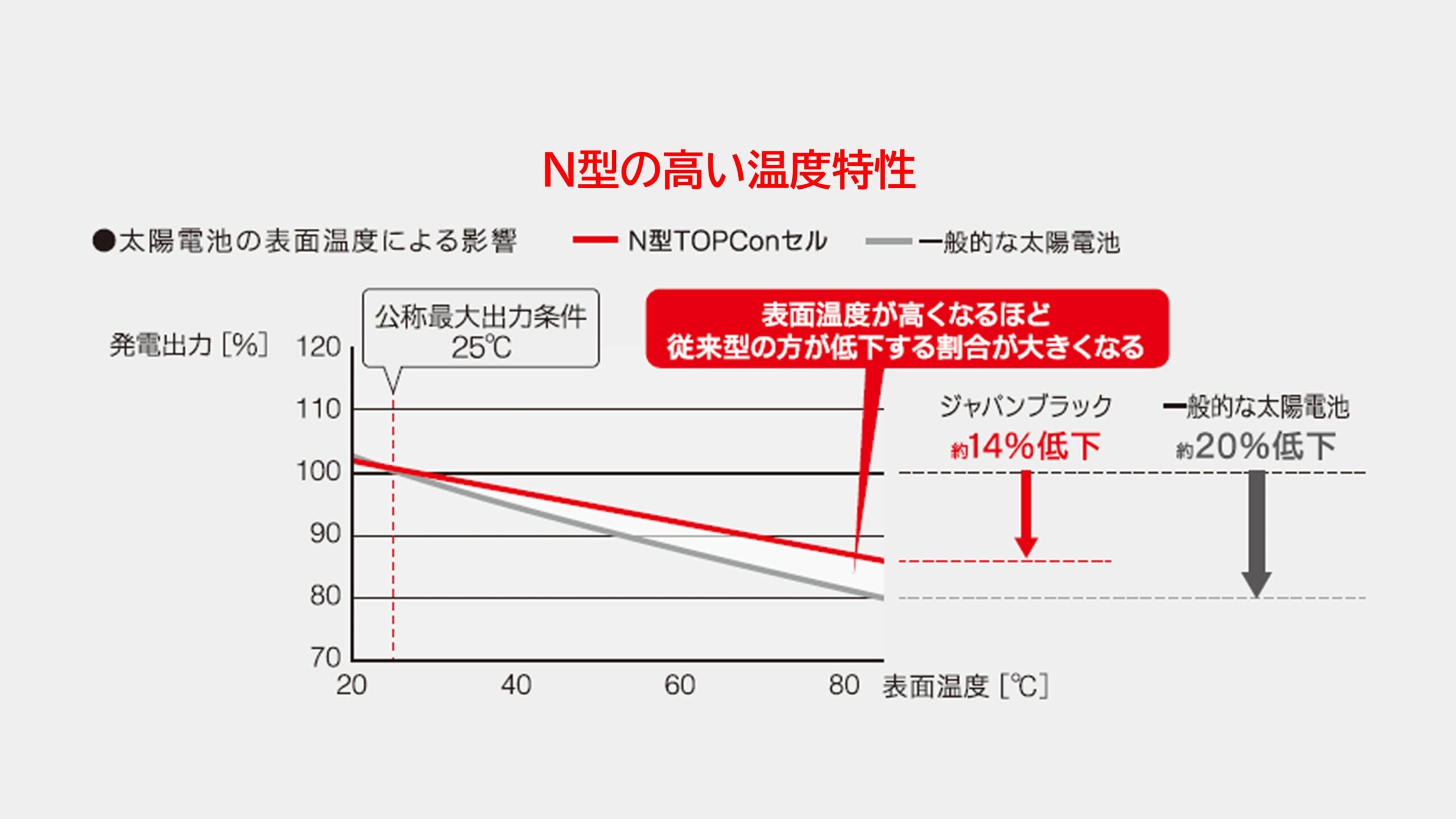 太陽光パネルは、真夏の直射日光で表面温度が70℃以上になると、発電効率が低下してしまう特性(温度ロス)を持っています。 しかし、新型Nシリーズで採用されたN型TOPConセルは、高温時の出力低下が非常に小さいという優れた温度特性を備えています。日本の長く過酷な夏場でも発電ロスを最小限に抑え、カタログ上の数値だけでなく、実際の使用環境での「実発電量」をしっかりと稼いでくれます。