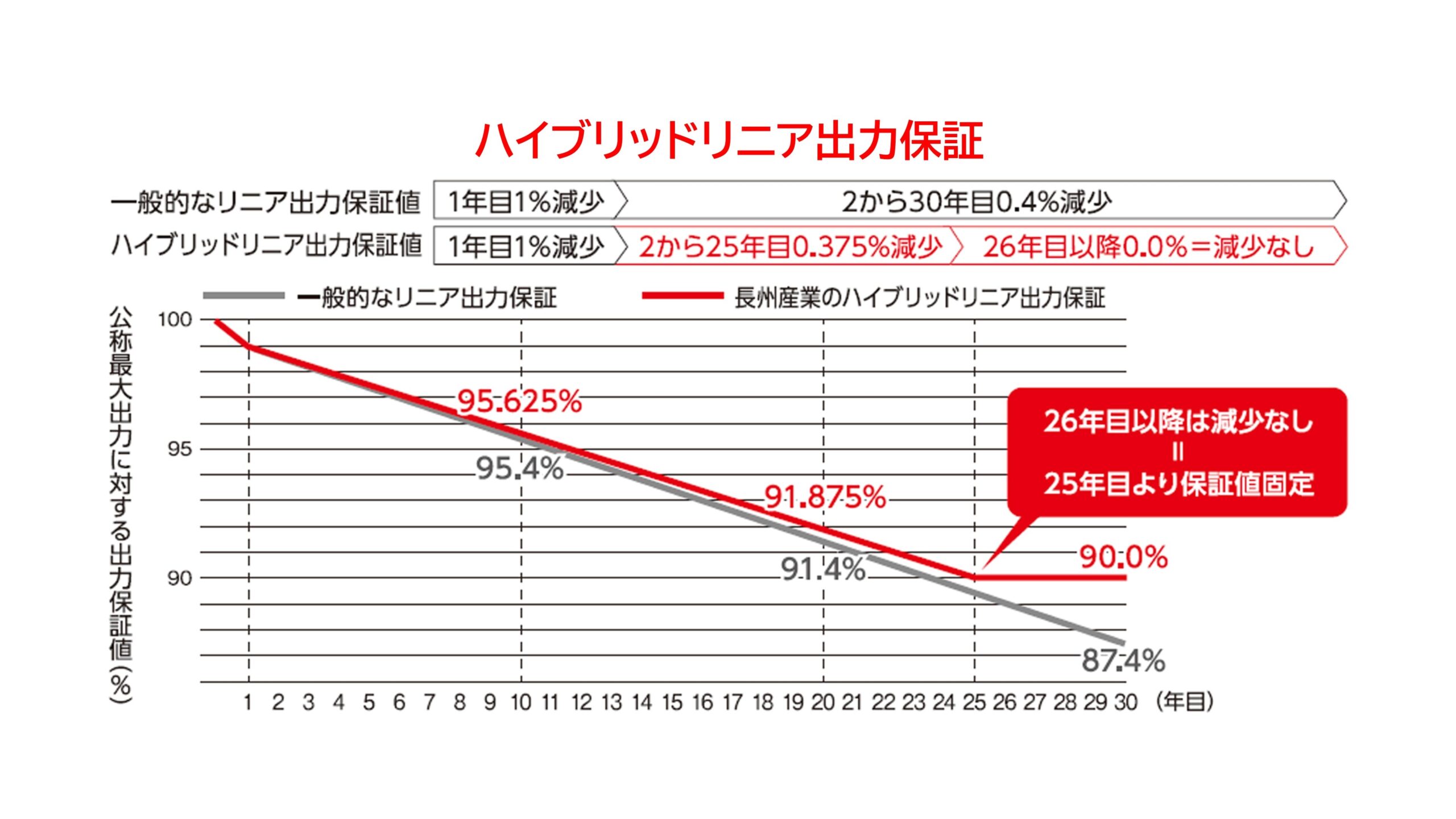 太陽光発電は10年、20年、30年と使い続ける設備です。長州産業は設計・製造・品質管理のすべてを日本国内の自社工場で行っており、万が一のトラブル時のサポート体制や部品供給のスピードにおいて、海外メーカーにはない圧倒的な安心感があります。 さらに、新型Nシリーズには「ハイブリッドリニア出力保証30年」が付帯。30年後でも初期出力の「90%以上」を保証するという、長く安心して使い続けられる強力なメーカー保証が用意されています。